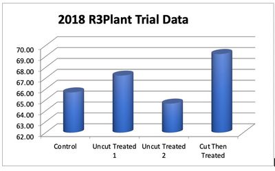 The first field was cut with a string brush cutter the second week of July 2018 . This field was located in South Eastern South Dakota and had excess moisture. The plants were cut to within 3.5 inches of the ground. The lowest node was all that was left of the plants. The first field was sampled in multiple locations within the field and samples were then averaged with 5 replicated samples per segment. The untreated and left uncut control had an average result of 65.7 bushels per acre. The uncut treated plants had an average yield result of 67.24 and 64.67 in each of the two test areas. The cut and treated area had an average estimated yield of 69.23 which is an increase of 3.53 bushels per acre when compared to the untreated an uncut area of the field. This is a astonishing recovery of the plants.